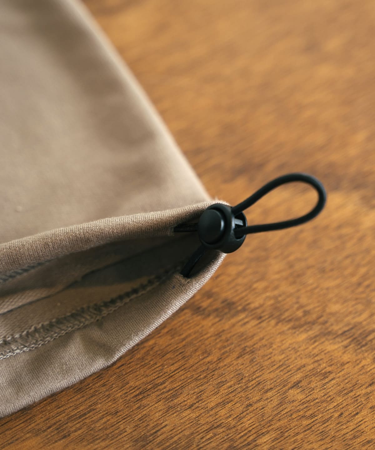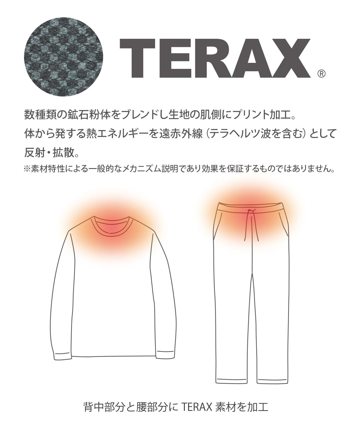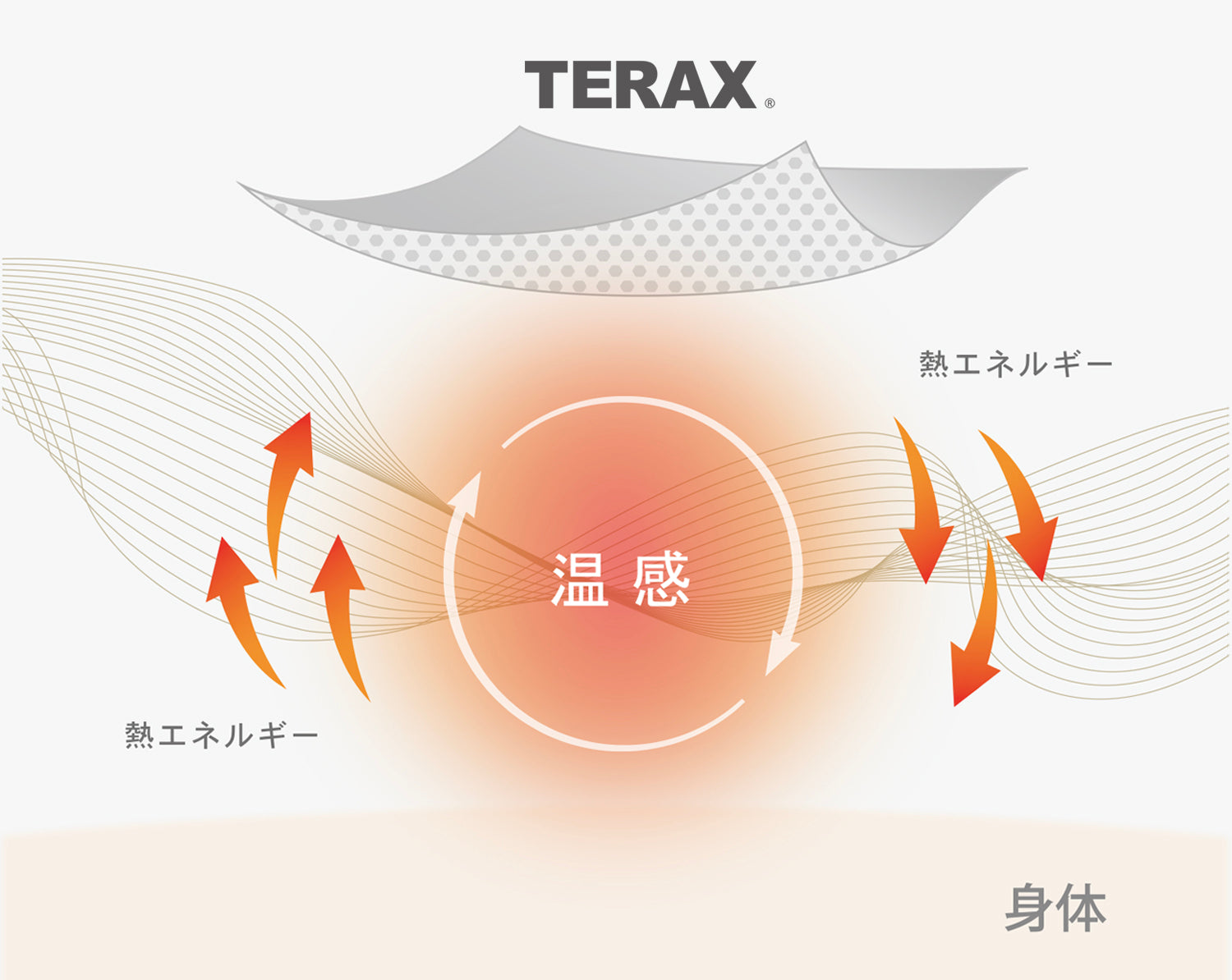 数種類の鉱石粉体をブレンドし生地の肌側にプリント加工。体から発する熱エネルギーを遠赤外線(テラヘルツ波を含む)として反射・拡散。